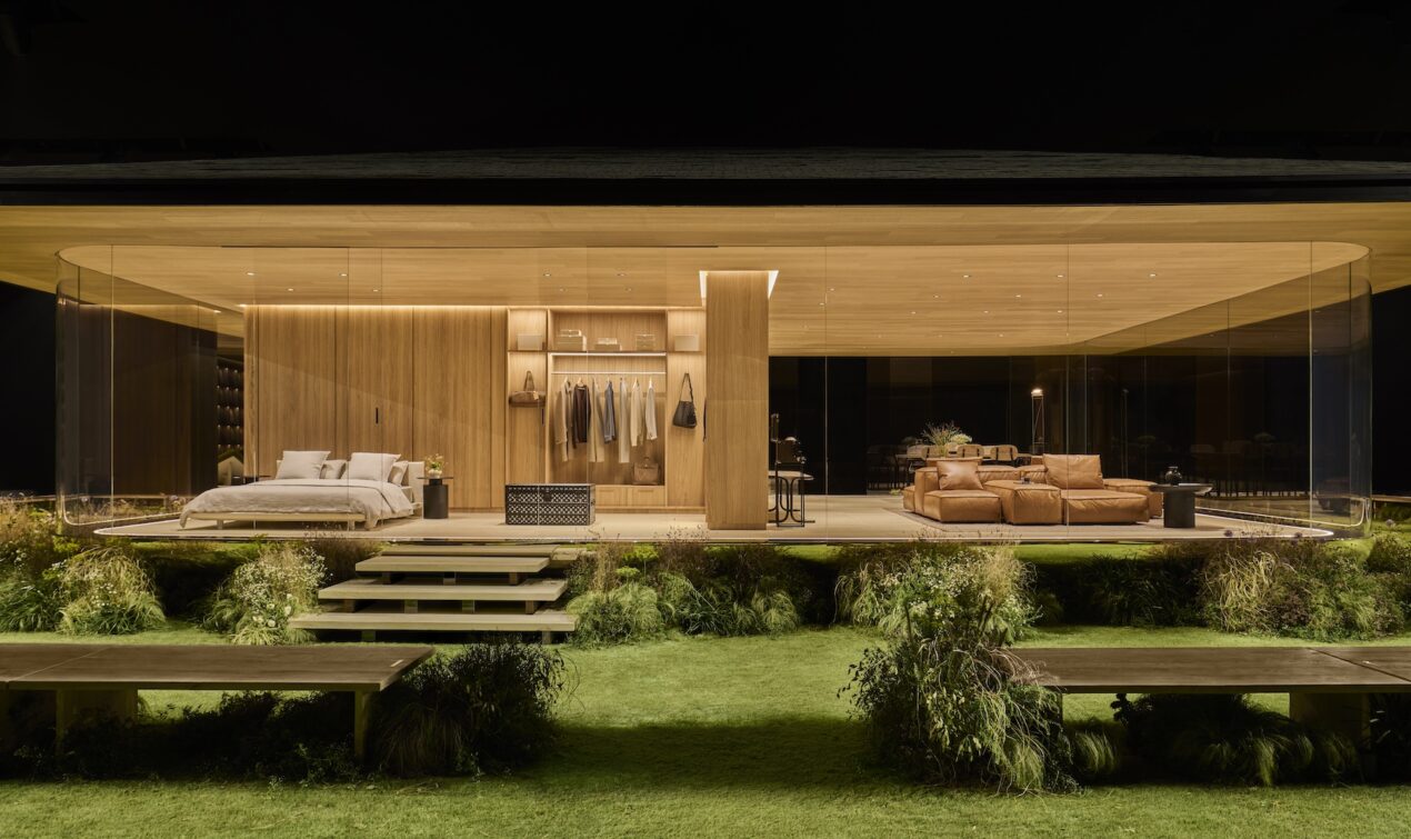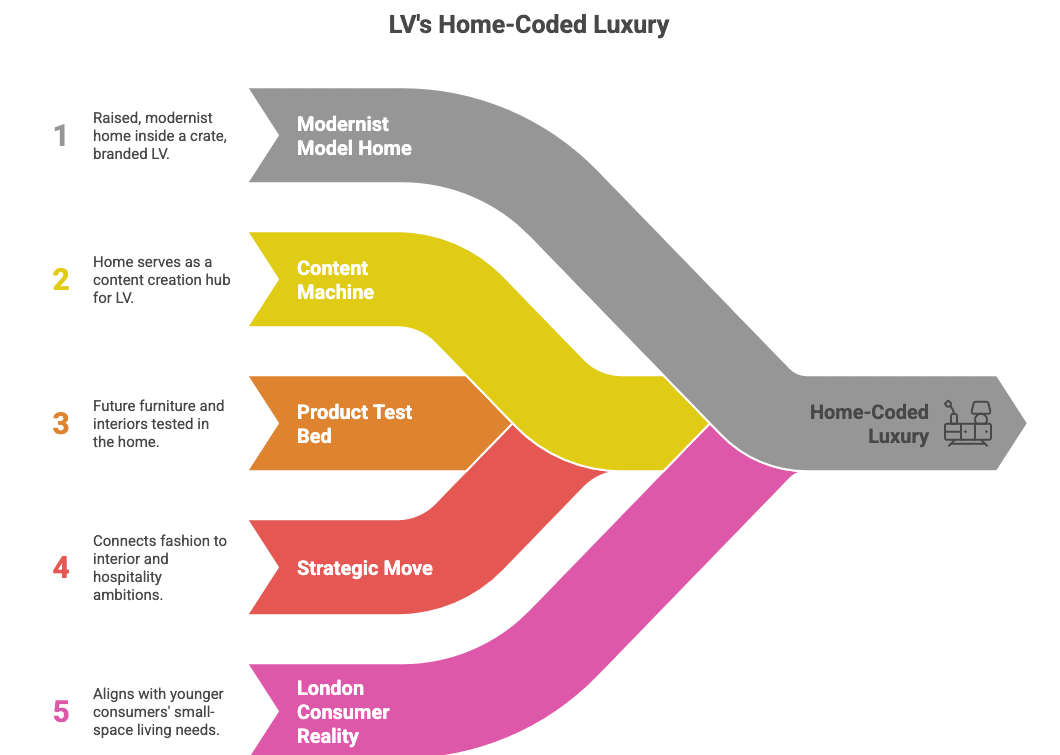 • The set: A raised, modernist model home inside a crate, branded “Louis Vuitton Fall-Winter 26 Men’s Collection,” doubling as a content machine and future product test bed for furniture and interiors.