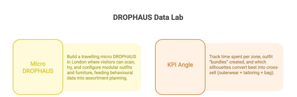 • Build a travelling “micro DROPHAUS” in London (think Shoreditch, Coal Drops Yard, Mayfair pop‑up) where visitors can scan, try and configure modular outfits and furniture, feeding behavioural data into assortment planning.